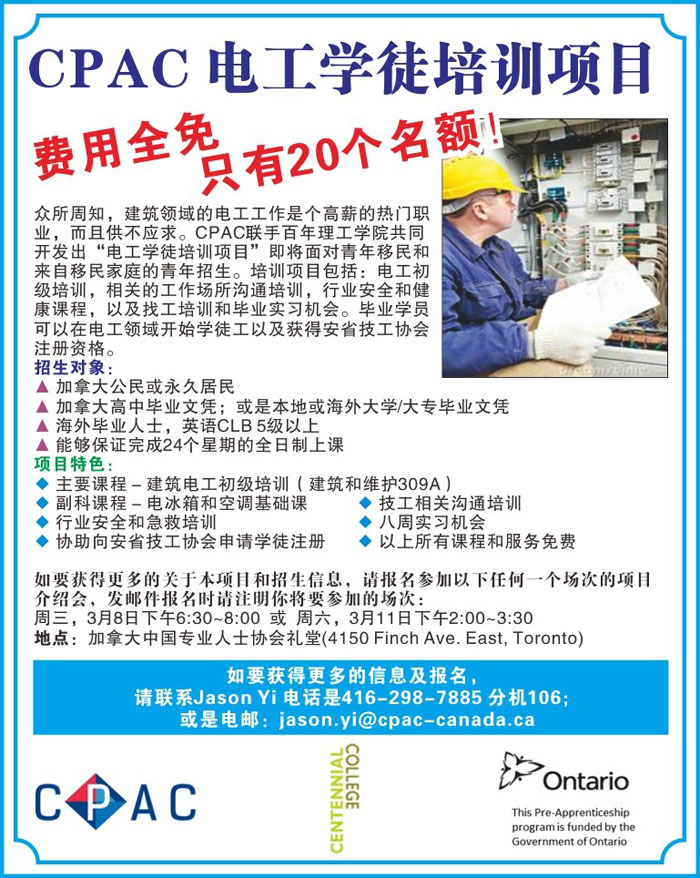 【加国生活网】加拿大同国内不同,在国内并不起眼的工作在加拿大却是好工作,比如建筑领域的电工,就是个高薪的热门职业,而且供不应求。面对许多新移民来到加拿大后找不到工作的问题,加拿大中国专业人士协会CPAC,这个服务了社区二十几年的非牟利机构,获得政府资助,联合百年理工学院共同推出免费培训的“电工学徒培训项目”,面向青年移民和来自移民家庭的青年招生,培训项目包括:电工初级培训、相关的工作场所沟通培训、行业安全和健康课程以及找工培训和毕业实习机会。毕业学员可以在电工领域开始学徒工以及获得安省技工协会注册资格。