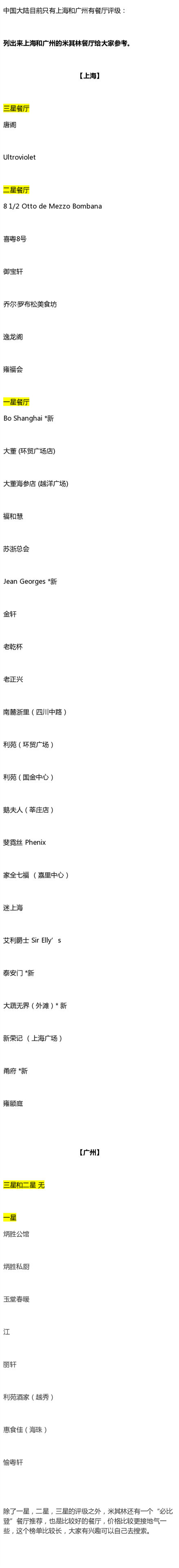 中国大陆目前上海和广州有餐厅评级,单子也给大家列了。