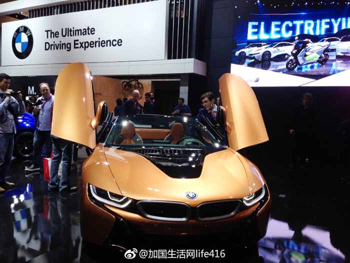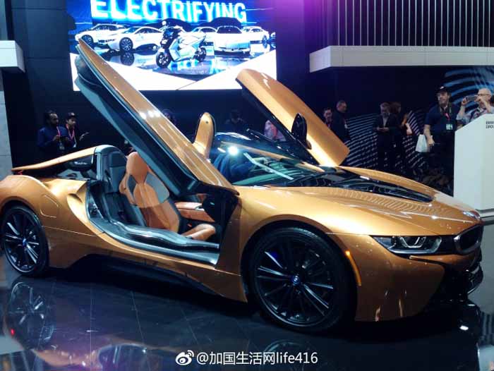 2019年BMW i8 Roadster敞篷跑车是该品牌混合动力超级跑车的首款版本(金色的哎,真漂亮)。与轿跑车一样,i8敞篷跑车采用1.5升三缸发动机与电动马达和9.4千瓦时锂离子电池相连。总功率输出额定功率为369马力,可以在4.6秒内将全轮驱动i8跑车从零开始提速至100公里/小时。i8跑车在其底盘和车身面板上广泛使用CFRP和铝。随着该款敞篷跑车在车展的推出意为着该款跑车将于春季发售。