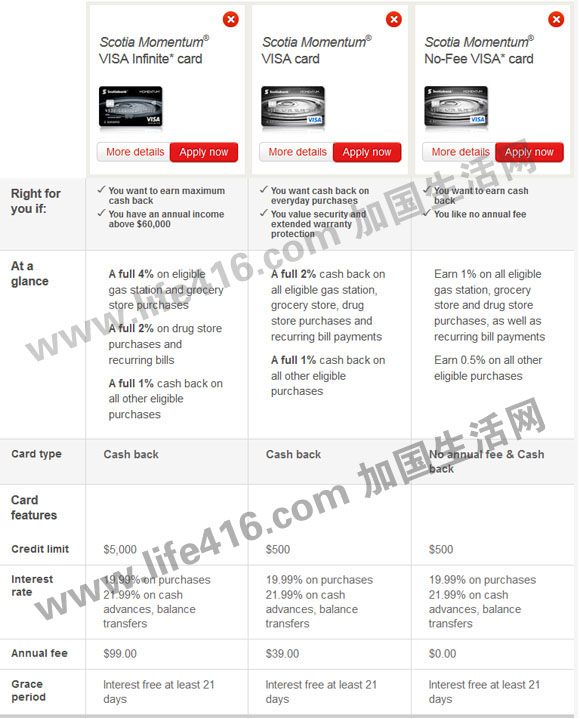 在Scotiabank 的众多信用卡中,现金返还信用卡有三种,全是Visa。这三种根据需要不同,返还现金也各不相同。小编制作了下表用来比较这三种信用卡的区别,大家一看就明白了: