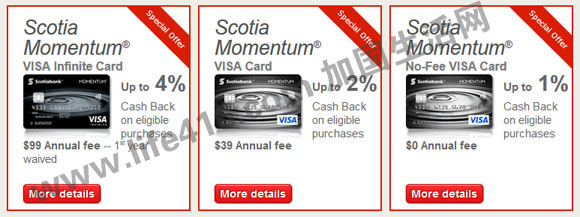 拿第一种Scotiabank Momentum Visa Infinite Cash Back Credit Card 来说,杂货和汽车返还4%、药物和每月固定水电帐单返还2%、其他返还1%,其中杂货和汽车返还4%是有花费封顶的,$25000以内是4%,之后就是1%了。另外,这个卡有$99年费,个人收入须达到$60000。