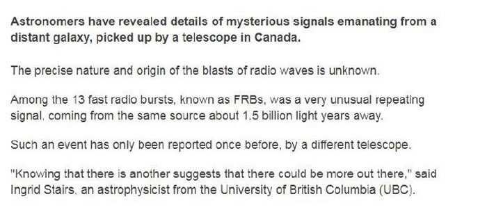 BBC报道称 加拿大发现15亿光年外的无线电讯号 来源未知但不排除是外星智慧的迹象