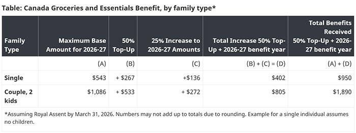 政府将推出全新的 “加拿大食品与生活必需品补助”(Canada Groceries and Essentials Benefit),即现有GST退税 的升级版: