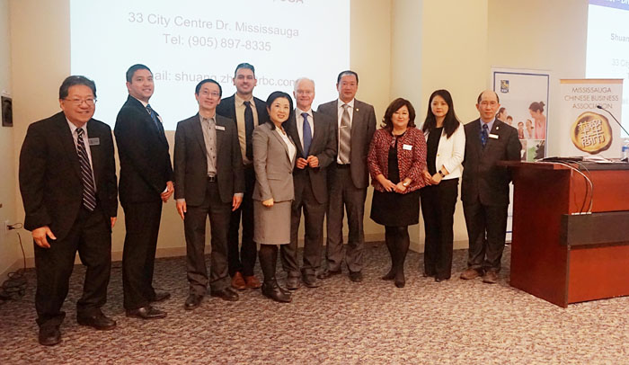 密西沙加华商会会长严雯(右三) 与RBC加拿大皇家银行副总裁彭清湘女士(左五)、 主讲嘉宾Mr. Paul Ferley(右五) 、周爽女士(右二) 和Mr. Matthew Diodati(左四) 及副会长黄伯毅(左一) 胡伟(右四) 、前会长和司库朱洪恩(左三) 、青年商会共同会长黄继宗(左二)合照。