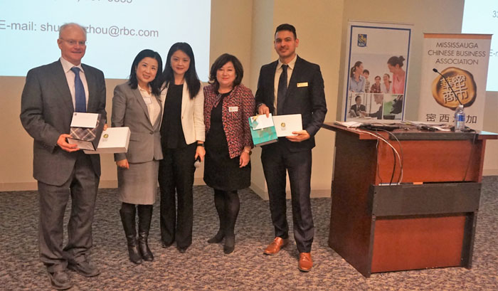 密西沙加华商会会长严雯(右二)与RBC加拿大皇家银行副总裁彭清湘女士(左二) 及主讲嘉宾Mr. Paul Ferley(左一) 、周爽女士(中) 和Mr. Matthew Diodati(右一)合照。