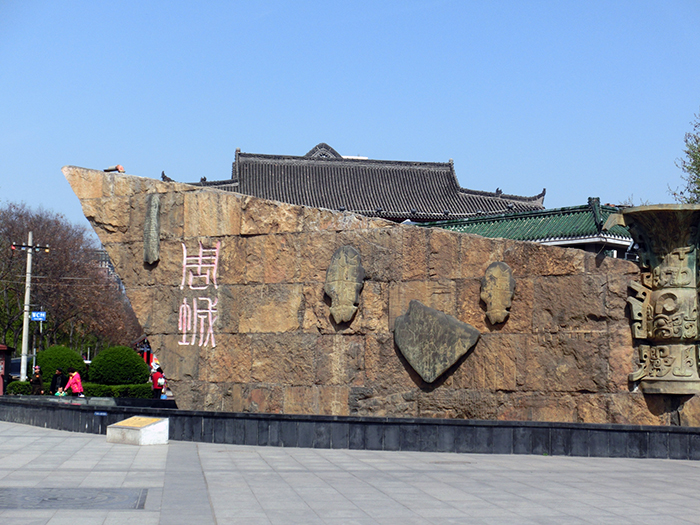 从石鼓阁的东侧登上一个小坡,又有隐藏绿树从中的一番景色,令大家有“柳暗花明又一村”的感觉。一汪池水中一人一骑的石雕威武雄壮,池周围的绿地散发着草香气,让喜爱卧躺拍照的女士们觅到了好地方。翻过小山坡,就要沿坡度很大的石路下山,一路上也有几处雕塑,其中记有“周公制礼”和“虞芮争讼”故事的石碑。转过一道弯,就来到了宝鸡青铜器博物院的楼前。其实,这个博物院的“平台五鼎”的标志性建筑我与夫人从咸阳机场乘车过来的路上就看到了,当时我很奇怪,怎么会有如此奇怪的造型,到了眼前我才知道它的来历,原来,这个风格独特的造型,浓缩了西周列鼎制度的深刻内涵,故显得格外气势雄伟、新颖别致。进到馆内,看到共有四个展厅,分别为“青铜之乡”、“周礼之邦”、“帝国之路”和“智慧之光”,这些展厅荟萃了宝鸡地区考古发现的青铜器、玉器、陶器、金器等精品,展示了周族兴起、古公迁岐、武王灭商、分封诸侯、周公礼制、秦君游猎、穆公称霸等一系列重大史实,生动的再现了周秦王朝的各个历史侧面,让我意识到青铜文化魂之所在,看到了周秦文明对华夏五千年所做的巨大贡献。特别需要提出的,展厅中制作的青铜冶炼过程的塑雕艺术的生动和详实,衷心为我们老祖宗的智慧和创造能力所折服和自豪。