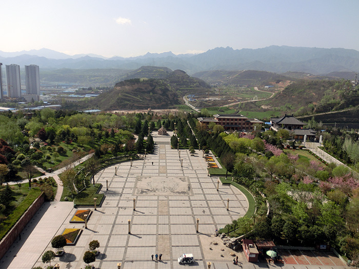 4月13日上午,我们全体乘坐17路公交车去到石鼓阁、青铜器博物馆游览。说起这路公交车,外表很整洁,但车型比较“古老”,乘客从前门进入的通道(在发动机罩旁)狭小,其发动机肯定是烧柴油或汽油,从舒适和环保角度需要进行升级。话说我们来到石鼓公园站,下得车来,宝鸡人盛轩也迷了路,几经打听,我们沿着一条便道和一座旱桥,终于从侧门进入了石鼓阁景区。看景区内的说明,方知所谓的石鼓是唐代古陈仓出土十面刻有文字的鼓状石头,经历了数百年的风雨沧桑,如今真品保存在北京故宫,复制品保存于宝鸡,此山和楼阁也因此而得名。据资料介绍,石鼓阁高56.9米,阁顶距滨河路相对高度110米,建筑面积7200平方米,仿秦汉建筑风格,采用外五内九的层级设置,气势雄伟,喻示着周秦文明在中华民族史上九五之尊的崇高地位,堪称西北第一阁,是宝鸡市地标性建筑。大家先以石鼓阁为背景拍摄了集体合影,再步入阶梯进入石鼓阁一层,凭身份证进入,里有二部直行电梯,其中一部只达三层,另一部可达顶层。自然我与几位同学一起登上阁顶,登高北眺,渭水近在眼前,渭水北岸高楼林立,一座廊桥飞架南北,桥下一块巨幅标牌上书“陈仓古街”四个大字,标牌四周均为灰顶古式房屋。向南望去,远处高低起伏绵绵秦岭如同奔腾的野马,近处时隐时显的山峦如同绿色海洋中的岛屿,而阁楼下经纬分明的广场地如同出车架炮的大棋盘,这景色可谓美不胜收,我有一种“乐不思蜀”的感觉,与洪福两人拍了一张又一张,才恋恋不舍地离开。