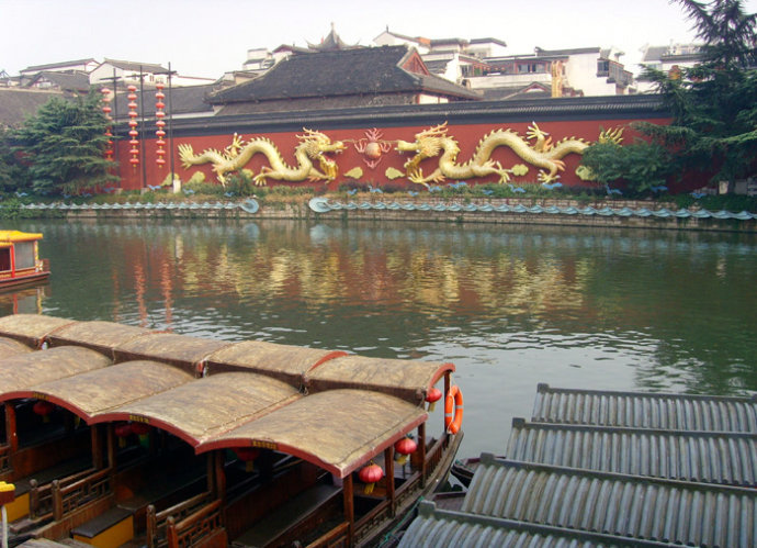 2011年10月7日下午游罢南京王谢故居、夫子庙和江南贡院,已是下午五点多钟,但盛轩夫妇坚持带我与爱人乘船游秦淮河。乘老王抢着买船票之间隔,我手抚岁月沧桑的石栏杆,神情地遥望秦淮河南岸飞腾在巨幅照壁上的双龙和镶嵌在黑瓦白墙上“秦淮人家”四个金字,晚霞的余光斜映在波光粼粼水面上,将高低错落飞檐楼阁的倒影构成一幅抖动着的水墨画。从文德桥孔中流出的水到此突然怀抱成近30米宽的椭圆形池畔,再从如宝葫芦般的大肚里流向另一端出口河道,这天工,这巧意,全映刻在南京人称谓的“泮池”之中,好似梦里到过的秦淮精华地,如今洋洋洒洒展现在眼前,美不胜收得令我如痴如醉。