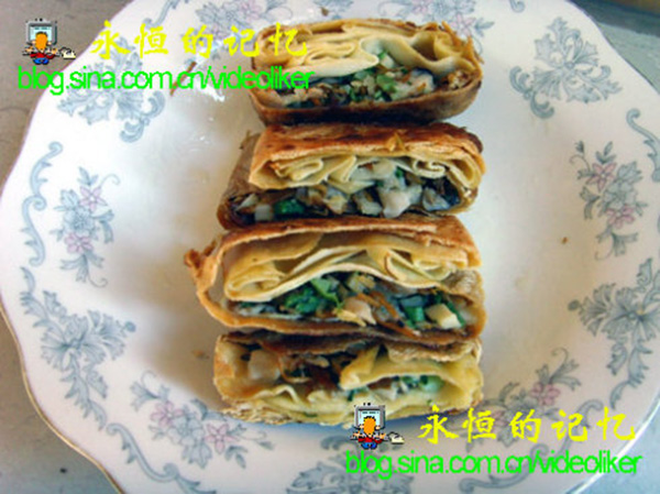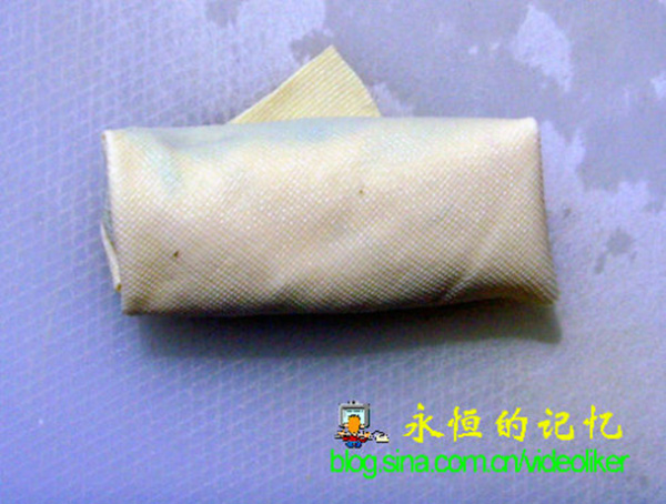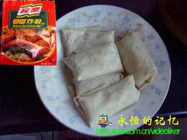 5、用香酥炸粉(超市里有卖成袋),用适量冷水“和”成稀面状(不可太稀,可渗入少量面粉)。将对角包好的豆腐皮卷在稀面中沾一下,使其四周均涂上炸粉。(见下图)