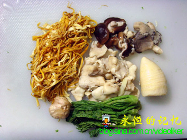 1、从超市选购来三种鲜蘑菇:香菇、海鲜菇、白玉菇,以及袋装金针蘑、山菜、冬笋。(见下图)