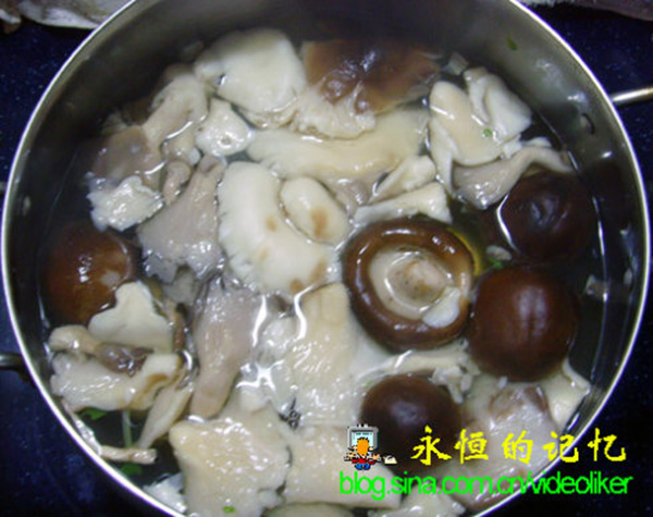 2、将香菇、海鲜菇、白玉菇洗净,将锅中水烧开后,将这三种蘑菇倒入锅中“焯”一下。再用冷水洗后,“控”去蘑菇中的水分。(见下图)