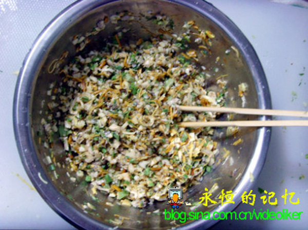 3、将开袋后的金针蘑、山菜、冬笋均用清水洗一下,与上述三种蘑菇一起,用刀将它们切成小细块。用适量姜末、细盐、酱油、鸡精、胡椒粉、味精、色拉油、香油调成素馅(见下图)。