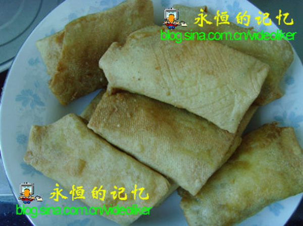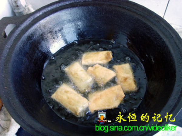 6、在铁锅中加入适量色拉油,加热至七成热,放入沾过炸粉的豆腐皮卷,刚放入时用筷子轻微压住,防备它散包,等其一定型,就可以随炸随翻动,使豆腐皮卷的两面焦黄。(见下图)