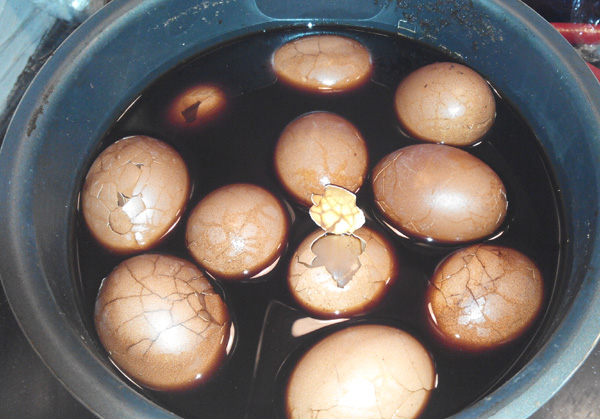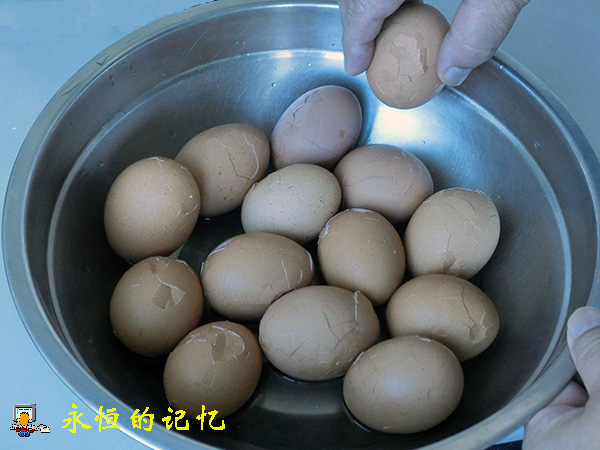 5、鸡蛋的碎壳。为了让调料和汤汁味道容易渗进鸡蛋内部,再逐个把鸡蛋外壳敲碎,但不要使外壳脱离。