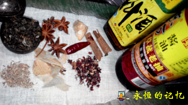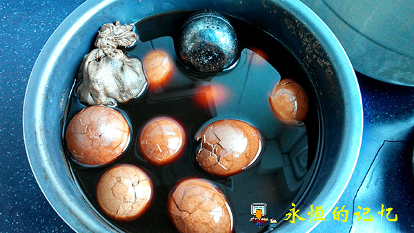 6、调料的配制。茶叶适量(最好用红茶,也是我常用的。根据口味,也有人用铁观音、普洱茶或花茶,大约为平时泡茶量的2-3倍,放入一只专用不锈钢合拢圆球内),大料(六角)4-5个、桂皮1-2小块,香叶3-4片,姜片1-2小块,花椒、小茴香和孜然(亦可不加)各1小撮,干辣椒1-2小根,陈皮若干片(有特殊清香)(以上配料用一块白纱布包扎在一起),生抽和黄豆酱油(老抽)适量(以增色),适量细盐(以加速鸡蛋进味),料酒适量。(注:网络介绍有多种配方,可各取所喜)