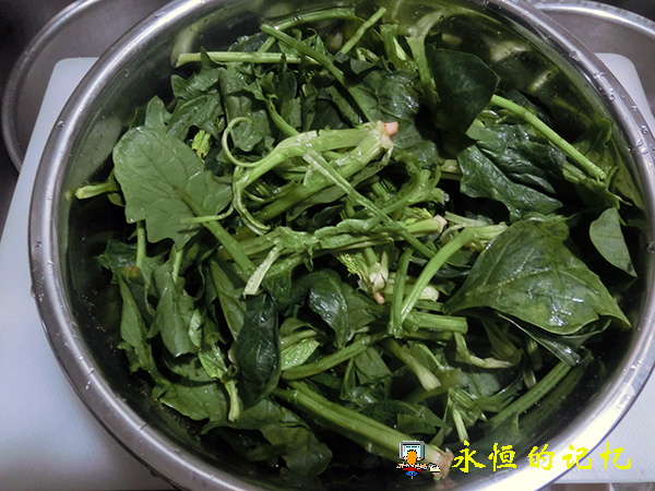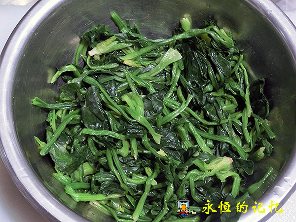 1、将菠菜摘捡(如长条菠菜可摘捡成段)后清洗干净,投入(不锈钢锅)沸水中快速“焯”一下,以除去残余农药和菠菜内草酸。