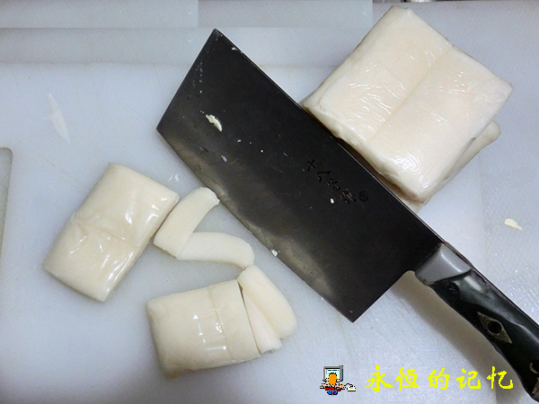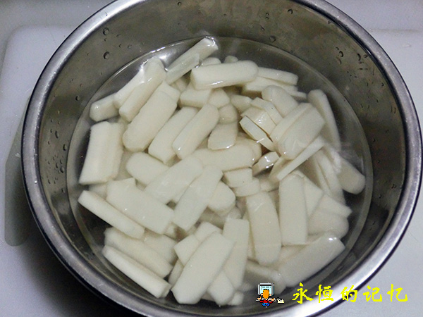2、将长条原味年糕(选用纯糯米粉制成)切成片,其厚度大约5毫米,太厚不易熟,太薄则容易断,再将年糕片投放冷水中泡10分钟,以初步软化年糕外表干膜和清除不洁物。