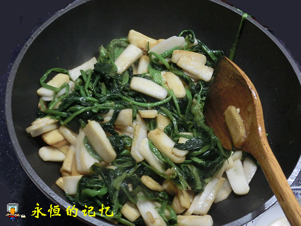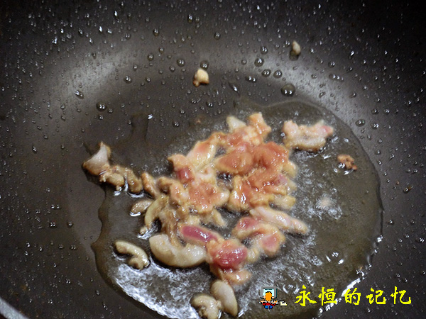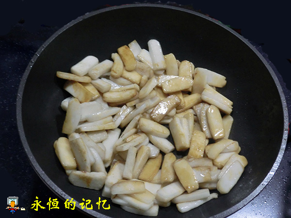 6、在上述第4步炒锅中另加入适量(可较多些)食用油,待油温热后,把上述年糕倒入锅中用大火不停翻炒(约1分钟),翻炒过程中加入适量生抽,炒制的目的是使年糕外表“定型”,即使其外表裹上一层“油膜”,片与片之间不沾粘,并保持年糕片内部软糯的温度。