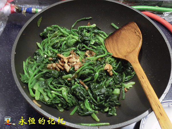 4、把焯过的菠菜倒入锅中,与猪肉丝混合一起大火快速烹炒(1分钟),烹炒过程中,只添加适量细盐,以保持菠菜之翠绿,记住一定不要太咸。之后盛入一只大碗备用。