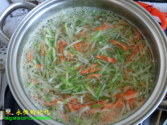 3、用锅烧开水后,将萝卜丝倒入,待水一冒泡,即可盛出萝卜丝。水“焯”目的是去除辛辣味,如“焯”得过烂,炸后的丸子没嚼头。