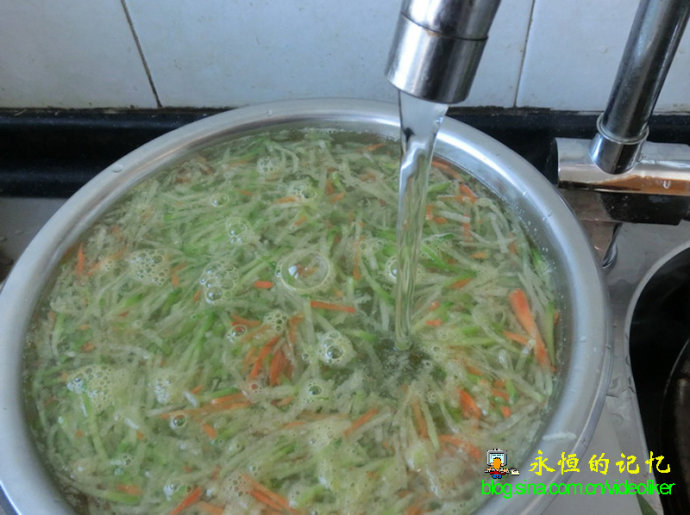 4、将“焯”好的萝卜丝倒入冷水浸泡,五分钟后用手捺干。
