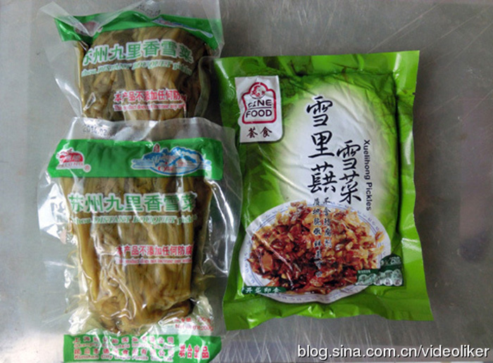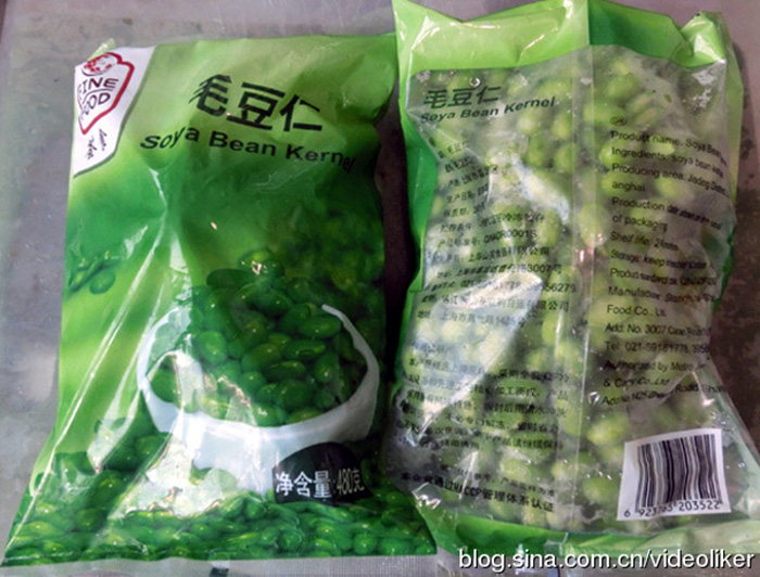 一次偶尔的机会,我在大连某超市发现多品种、成袋包装、可即开即食的“雪里蕻雪菜”(见图01右),包装袋面写有“不含任何防腐剂”的字样,产地为上海、苏州等地。价格不算贵,如下图中的“雪里蕻鲜笋”价格为3.70元/250克。我先买了四小包品尝,觉得确有家乡雪菜的味道。后来,我又在这家超市冰柜里寻找,发现居然也有卖袋装的冰冻新鲜毛豆仁(见图02、图03),价格6.8元/480克。我又买了两袋,拿回家开袋检查,发现里面的冻毛豆仁品相青绿,粒整新鲜,闻味道很清香。