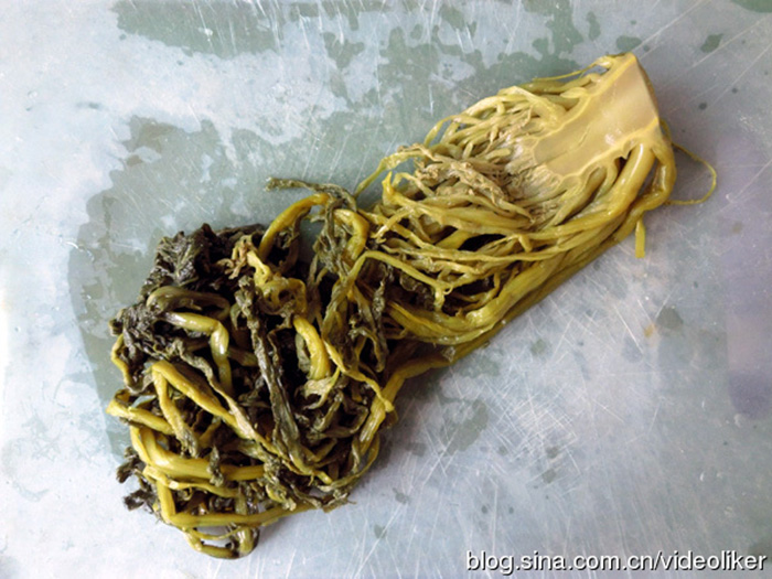 尽管上述雪里蕻为即食食品,但要与生冻毛豆相配,为使口味更鲜美,故还需要烹制一下。方法很简单:先在炒锅内放入植物油(我用的是稻米油),先将毛豆加大火煸炒大约3分钟,煸炒时添入少许浅色酱油。再将开包后的“雪里蕻”倒入一起翻炒2分钟,翻炒过程中添加入二小勺白糖,即可起锅装盘(见图4)。另外提一下,照片中还有一份苏州产的“九里香雪菜”(3元/包),里面装半棵雪里蕻(见图01左,图5),需要自己用刀切成小粒,较咸,需用清水浸泡半小时,烹调方法同上,此菜我用油炸花生替代毛豆(见图06),各有其风味,随心所用。
