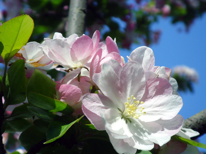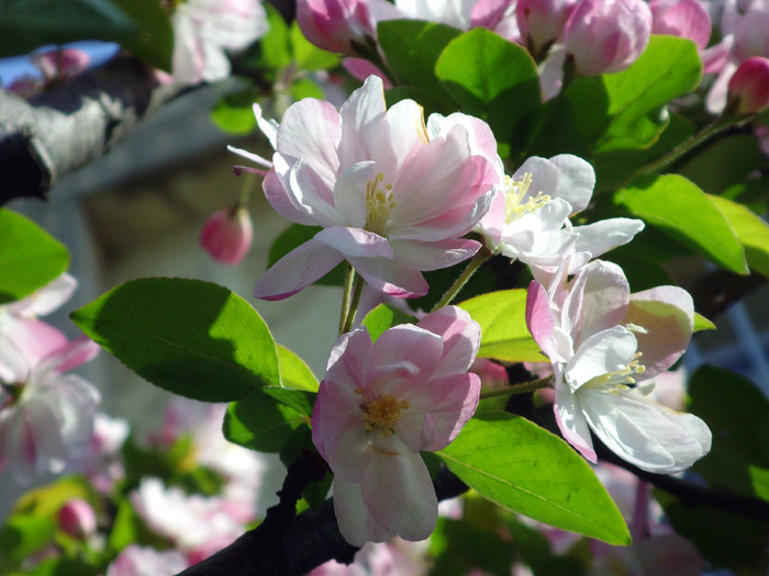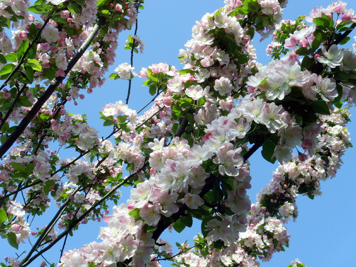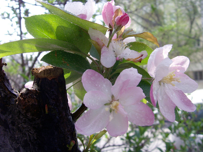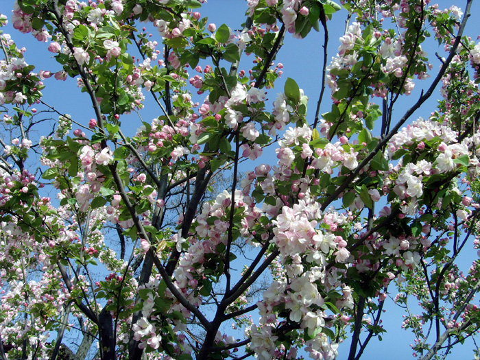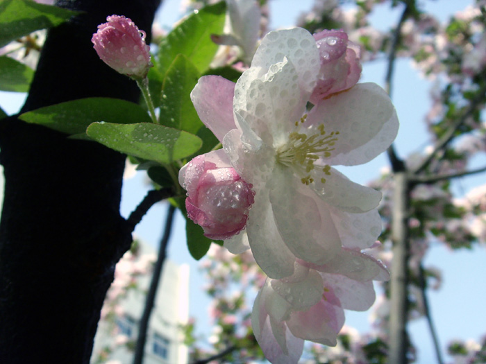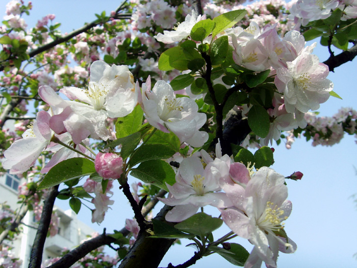 我家附近小区院里有几株西府海棠树,五月,正是海棠花盛开的时候。当清晨雾气未散的时候,我徜徉在树下,品赏胭红点点的花蕾,嗅闻沁人心脾的幽香,陶醉在粉红娇柔的花枝丛下。