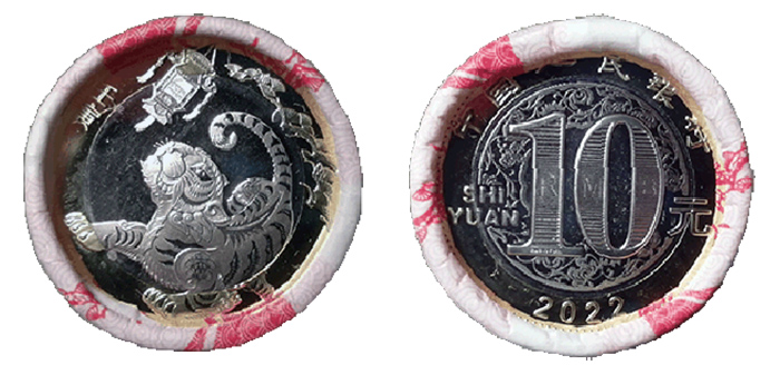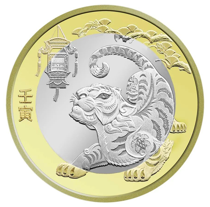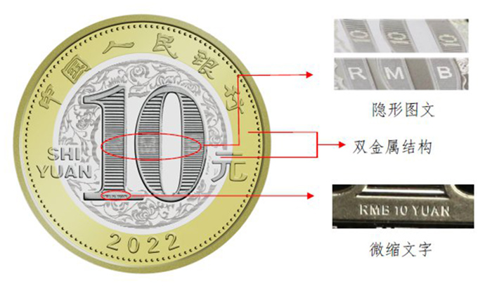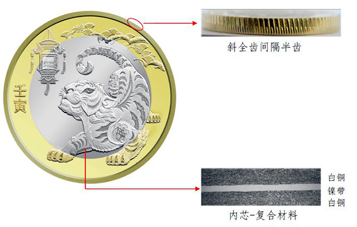 据资料所称,虎年纪念币的公众防伪性也很有特点,除了与以前的纪念币相同的双金属结构和内芯复合材料,以及硬币外缘分布有交替排列的斜全齿与半齿结构外,纪念币的正面面额数字“10”的底端,可观察到“RMB 10 YUAN” 的微缩文字。将纪念币倾斜适当角度,可在正面面额数字“10”的轮廓线内,分别观察到“RMB”和3个“10”两种隐形图文。