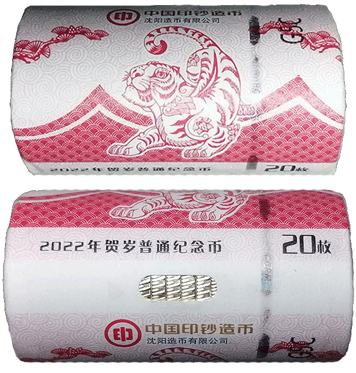 再看一下我所兑换的虎年纪念币的外包装,卷纸上印制了与虎年纪念币相同的老虎形象,以及松枝、松果等图案。并标有装币的数量“20”枚。还印有“中国印钞造币”字样,标明了造币企业为“沈阳造币有限公司”(我想,辽宁地区肯定分配为该企业虎年币)。据资料介绍,这次的虎年纪念币共有二个造币企业,另一企业为“上海造币有限公司”。从卷纸表面的小长方形窗口可看到虎年纪念币的边缘造型。