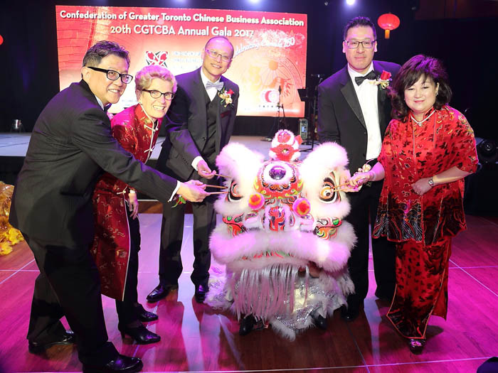 密西沙加华商会会长严雯(右一)、列治文山市万锦市华商会会长陈卓彦(右二)、多伦多华商会会长周大军(中)、士嘉堡约克区华商会会长何启新(左一)与安省省长韦恩Kathleen Wynne(左二)为醒狮点睛合照。