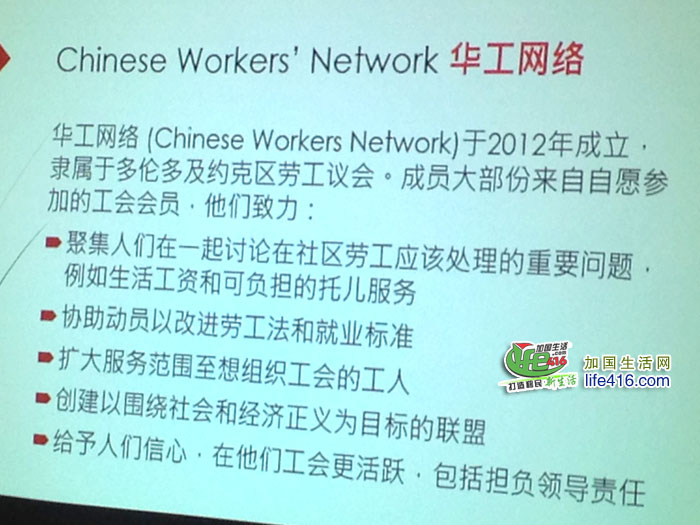 劳工议会在现场还着重介绍了华工网络(Chinese Workers Network),华工网络成立于2012年,隶属于多伦多及约克区劳工议会,成员大部份来自自愿参加的工会会员,他们致力: