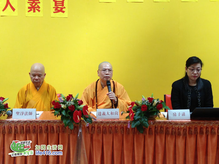 加拿大佛教会会长、湛山精舍主持达义大和尚介绍说,今年恰逢湛山精舍三位长老来加拿大弘法五十周年。五十年来,汉传佛教在加拿大从无到有、从小到大、从默默无闻到影响广泛,半个世纪的风云激荡,半个地球的薪火相传,三代人开拓耕耘,湛山精舍成为汉传佛教在北美传播历史的最佳见证。湛山精舍四众弟子格外珍视湛山大德倡导的智慧慈悲、护生放生的功德。所以,对今年的千人素宴贺佛诞格外重视。