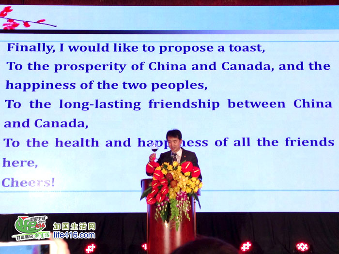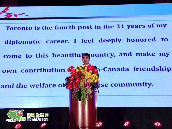 何炜总领事在致辞中表示,来到多伦多虽仅半个月,但通过走访和交流,已强烈感受到领区人民对中国人民的友好及对加强中加交流合作的期盼,深感使命光荣、责任重大。何总领事简要介绍了中国经济发展最新情况和新一轮深化改革、扩大开放的重要举措,回顾并展望了中加关系进入新的“黄金时代”后两国及中国与领区间各层级务实合作的发展,高度评价领区华侨华人为推动双边关系发展作出的积极贡献,表示将率领总领馆全体同事一起“撸起袖子加油干”,推动中国与领区开展更多务实合作并惠及双方民众,继续践行“以人为本、外交为民”理念,全力维护领区中国公民和企业合法权益,并努力为侨胞提供更加优质便利的服务。