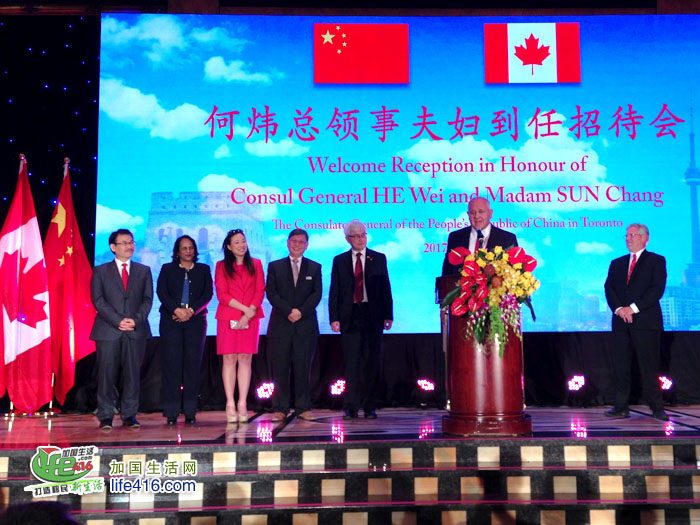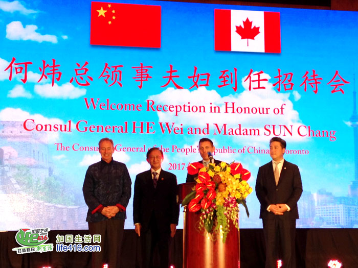 【加国生活网】中国驻多伦多总领事何炜和夫人孙畅于2017年4月14日举行到任招待会。加拿大联邦参议员胡子修,联邦众议员庄文浩、陈家诺、谭耕、马万里(Majid Jowhari)、扎西德(Salma Zahid)、奥利芬特(Robert Oliphant)、拉坦西(Yasmin Ratansi)、陈圣源、蔡报国(Bob Saroya),安大略省议会反对党领袖彭建邦(Patrick Brown)、省议员董晗鹏、赵成俊(Raymond Cho)、科埃(Lorne Coe),万锦市市长薛家平(Frank Scarpitti)、列治文山市市长巴罗(Dave Barrow)和大多伦多地区多位区市议员等加三级政府代表,俄罗斯、韩国、日本、缅甸、柬埔寨、乌干达等国驻多伦多领团代表,以及多伦多华人团体联合总会主席林性勇等华侨华人、中资机构、留学生等各界人士近千人出席。