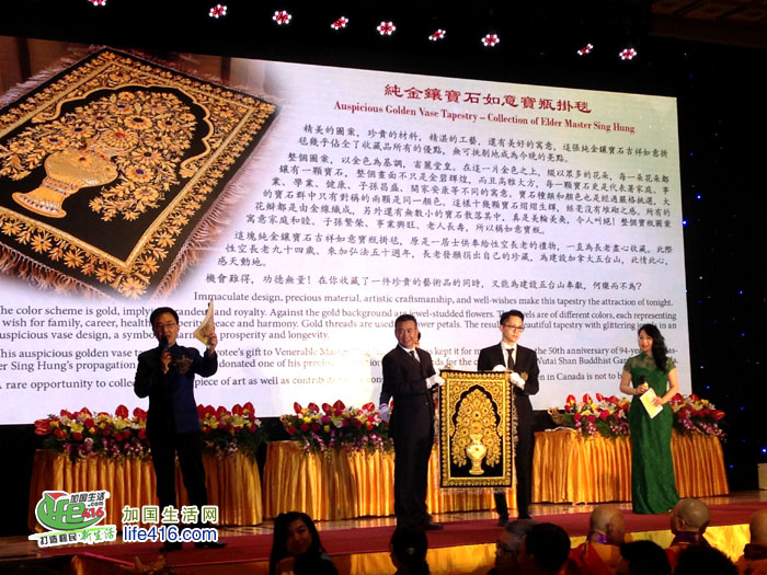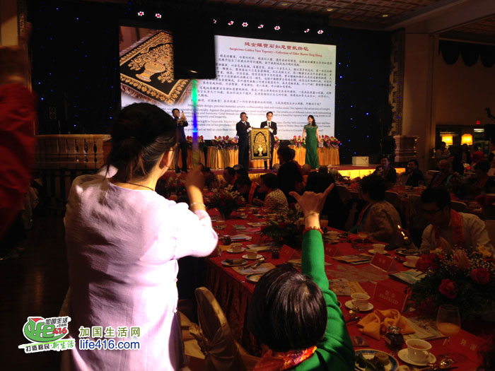 纯金镶宝石如意宝瓶挂毯的拍卖引发全场高潮,出价声此起彼伏,瞬间就从1千加币叫价到5万加币