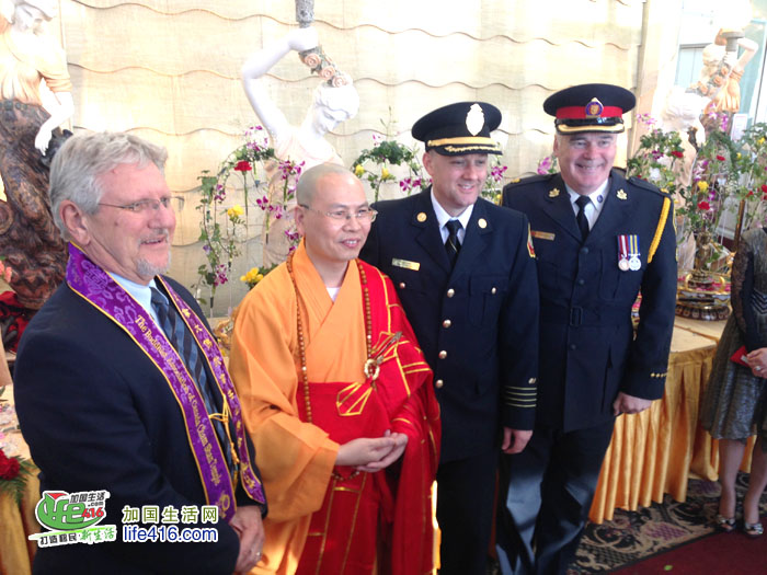 参加本届千人素宴的政要有联邦国会议员代表、安省移民部部长、经济部部长、文化厅陈国治厅长、和安省议员,各市区的议员、约克警局局长、多伦多警局高级警司,万锦市消防局局长、五台山所在城市的市长,以及中华人民共和国驻多伦多总领馆徐伟副总领事。政要代表们在致辞中对湛山精舍在加拿大多元文化发展,维护社会安定,促进文化交流等方面的贡献给予极大地肯定和感谢,表达了佛陀智慧对当今世界和人类的重大意义。中国驻多伦多副总领事徐伟先生在致辞中对加拿大佛教回为中加两国人民的友好做出更大的贡献表示感谢!