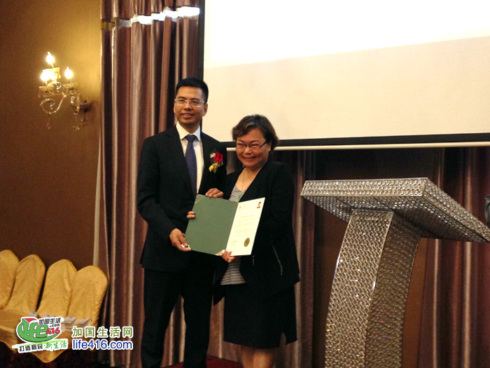 国会议员陈圣源助理杨龙宝娟(右)颁发贺词