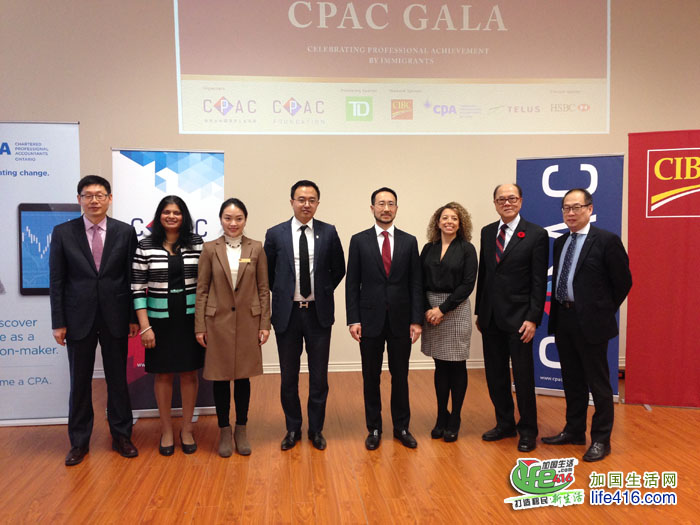 集体合照——从左至右:CPAC执行总监时安迪、安省注册专业会计师协会(CPA Ontario)招生经理Carmen Jacques、加拿大帝国商业银行(CIBC)亚洲业务高级顾问Michelle Qiu、加拿大帝国商业银行(CIBC)流动房贷顾问GTA East区域销售经理Alan Tong、CPAC会长肖楚强、钻石赞助商研科(TELUS)多元文化市场部经理Sarah Beale、CPAC基金会主席林瑞铭、CPAC基金会理事张怡专