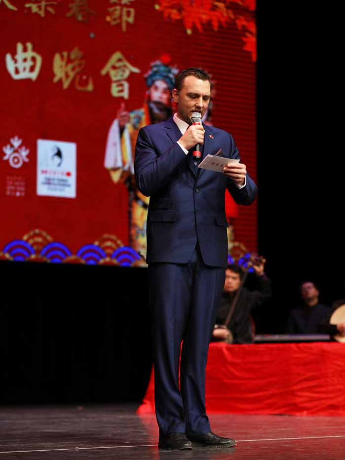 副总领事庄耀东与青年演员朱虹(优秀梅派青衣)同台演出