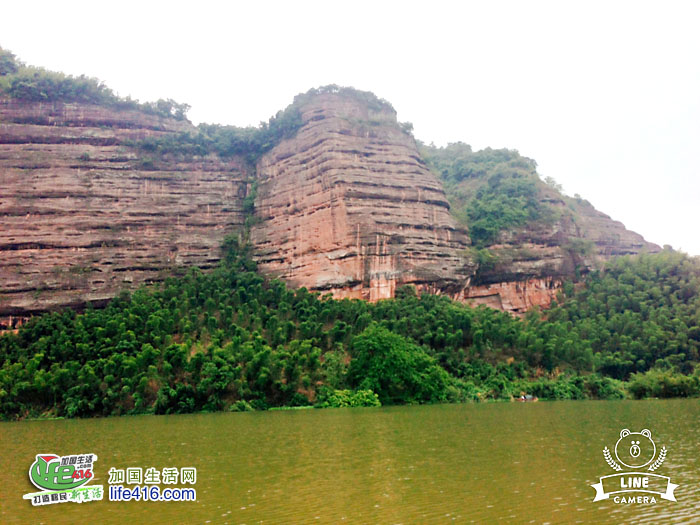 拐弯处就来到一大片水域,原来飞天山景区是集丹霞地貌,溶洞、碧水,温泉于一体的地方,青山、绿水、红崖赤壁、竹林深深,构成一幅雄、奇、险、秀,美仑美奂的自然画卷。