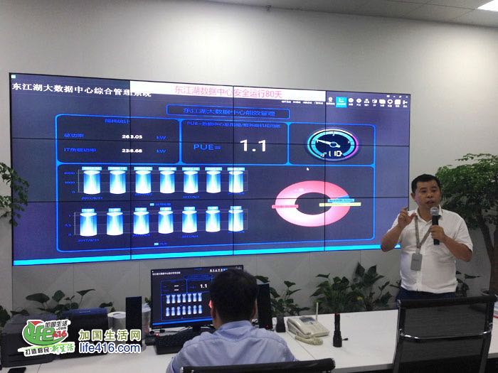 众所周知,电脑一打开就会发热,而让500万台服务器24x7同时不间断工作的话,耗电和散热都是大问题。大数据中心则拥有一套自主设计的致冷系统,由于东江湖湖面面积160平方公里,蓄水量81.2亿立方米,每年至少有15亿立方米、常年保持在5-13℃的冷水流经东江湾,大数据中心就利用这个优质的冷水资源来制冷,不仅解决了散热问题,还能节约用电50亿度,其PUE值能常年稳定在1.2以下,成为全国最环保的大数据中心。