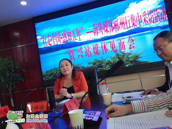资兴市委书记黄峥嵘在“海外媒体郴州行资兴站媒体见面会”上接受海外媒体记者们的采访,介绍资兴发展和东江旅游开发的情况