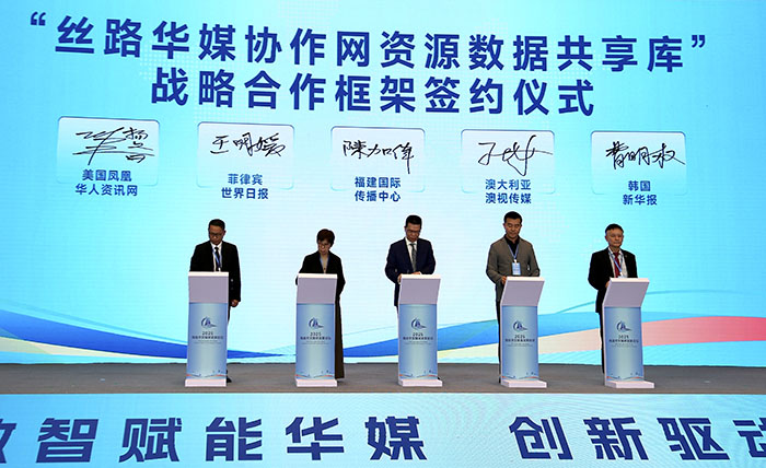 论坛开幕式上,菲律宾世界日报、澳大利亚澳视传媒、美国凤凰华人资讯网、韩国新华报4家华文媒体与福建国际传播中心签订共建“丝路华媒协作网资源数据共享库”战略合作框架,希望依托福建国际传播中心的丰富的资源,为全球华文媒体提供一个高效、智能、开放的媒体内容共享库,深度挖掘福建在数字经济、绿色发展、乡村振兴等领域的优秀实践案例及成果,并通过自有渠道进行内容发布,为讲好福建故事、传播好中国声音贡献力量。