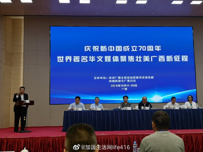 【加国生活网】五洲华媒聚八桂,广西故事成焦点。“庆祝新中国成立70周年·世界华文媒体聚焦壮美广西新征程”活动于2019年10月15日在南宁启动,来自世界五大洲19个国家和地区的42家媒体将零距离感受广西日新月异的新变化。广西壮族自治区党委常委、宣传部部长范晓莉和中国新闻社副总编辑张明新出席启动仪式,致辞并为采访团授旗。