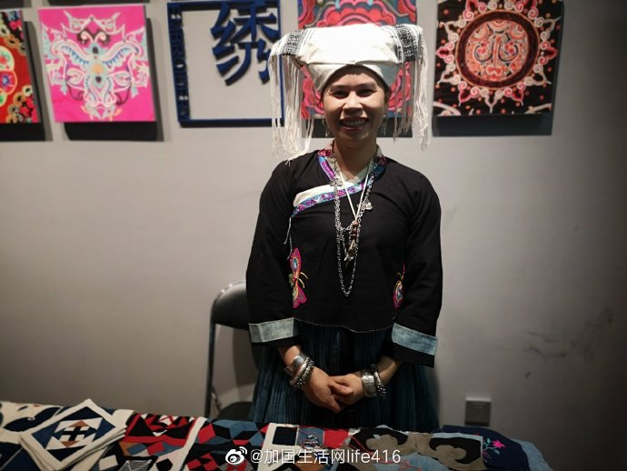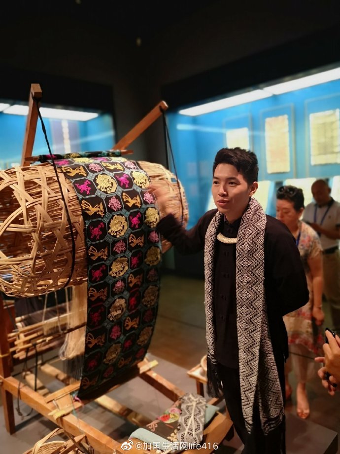 这位帅气的壮族小伙已是一位出名的服装设计师,他织出的织锦在国际市场上极受欢迎,他脖子上那条围巾,用一根蓝色经线做底色,一根白色纬线做花纹,光是这条织锦围巾就要卖8千多人民币。