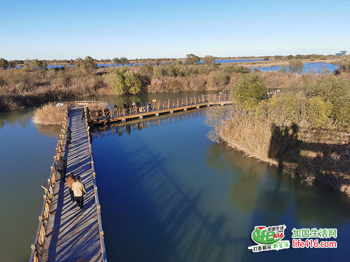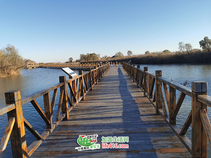 黄河故道天然柳林木栈道入口,长800米,木栈道上,可以一边观鸟赏鱼,一边品味曲径通幽的闲适,不时会看到鸿雁和斑头雁从身边游过。栈道周围傍水而生的高大植物群带就是天然柳林,种子从黄河上游冲刷下来,在这里落地生根、自然生长。