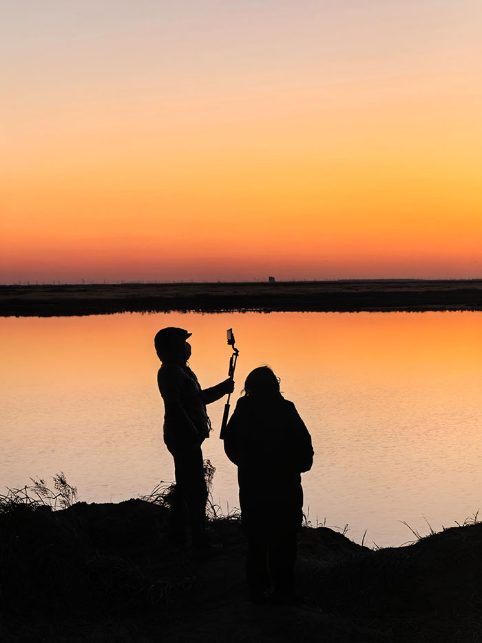 采访团原计划是在黄河口生态旅游区参观,就在太阳快落山、采访即将结束的时候,旅游区工作人员推荐采访团去看“鸟浪”,看“鸟浪”地点开车大约需要10多分钟,但是否能看到就要看大家的运气了。于是,采访团快马加鞭赶往“鸟浪”最佳观赏地点。