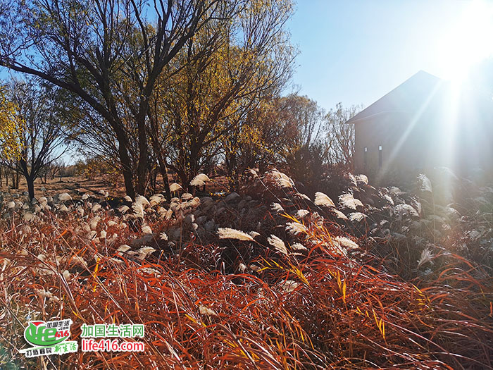 夕阳为连片芦苇镀上金边,随风漫卷的芦花与湿地相映成趣,熠熠生辉