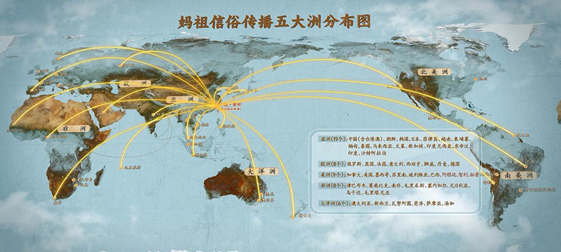 随着中国航海业的发展,妈祖信仰逐渐传播到世界各地,妈祖护佑航运的功迹举世闻名,使得每兴一座港口,妈祖庙随之而建,妈祖文化也随之扎根于所在区域,逐渐形成“有海水处有华人,有华人处有妈祖”的世界性文化现象,如今,全球50个国家和地区分布着1.1万余座妈祖宫庙,敬仰者超过3亿人。